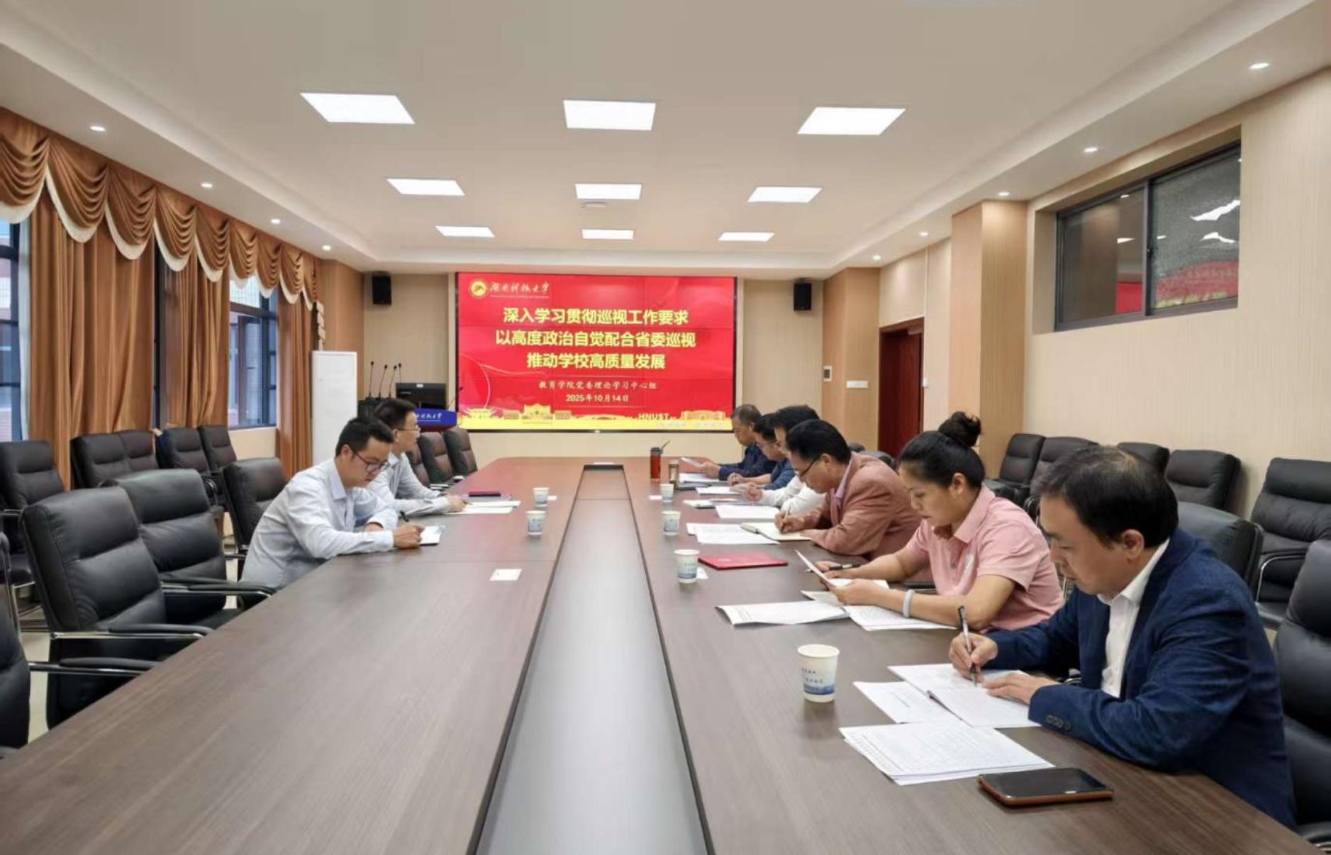 为深入学习习近平总书记关于巡视工作的重要论述,贯彻落实巡视工作要求,以高度政治自觉配合省委巡视,推动学院高质量发展,10月14日,教育学院党委理论学习中心组在敏行楼A333开展2025年第九次集体学习。院党委书记傅早霞主持,院党委委员、专职组织员参加学习。学校宣传部、统战部副部长韩平,理论教育科科长曹文星到会指导。