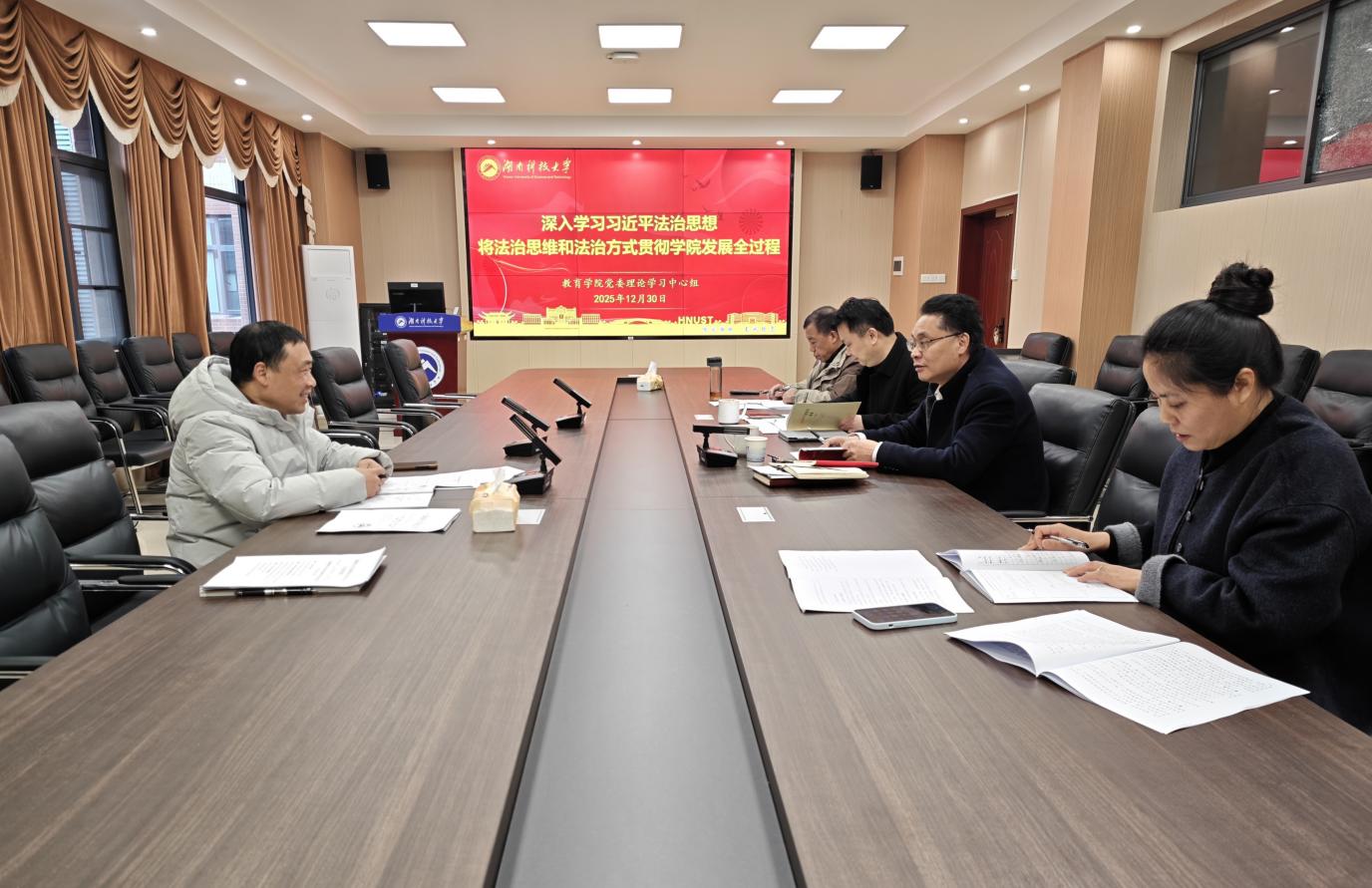 为深刻领会习近平法治思想的核心要义与实践要求,切实将法治思维和法治方式贯穿学院发展全过程,12月30 日,教育学院党委理论学习中心组在敏行楼A333举行2025年第十二次集体学习。院党委书记傅早霞主持学习,院党委委员、专职组织员参加学习。