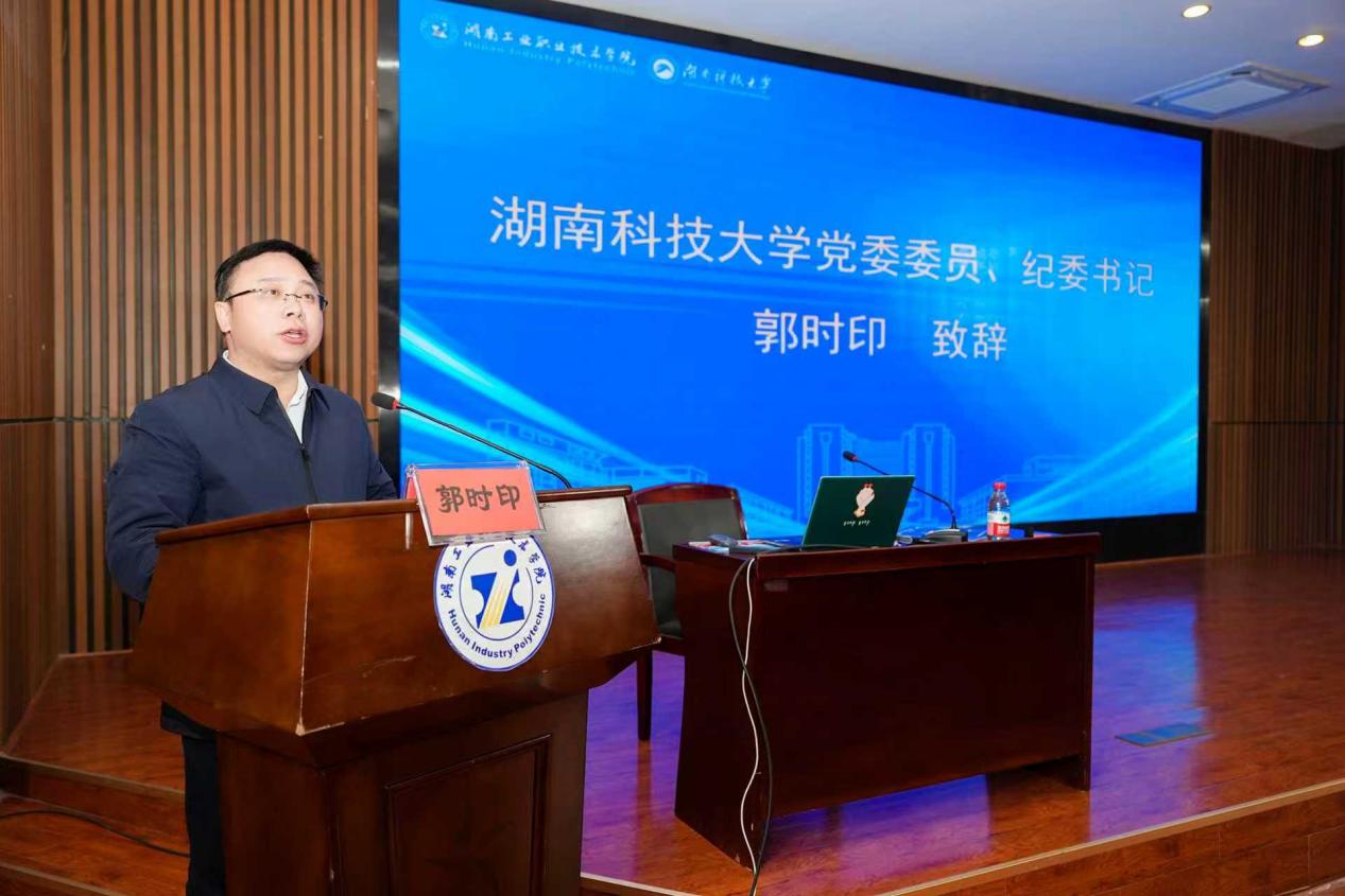 我校党委委员、纪委书记郭时印在会上致辞。他指出,湖南科技大学与湖南工业职业技术学院等院校长期保持密切合作,在专业建设、实训资源共享、师资互聘等方面取得显著成效。他强调,作为一所有着深厚职教情怀与责任担当的高校,湖南科技大学将持续深化与职业院校、行业企业的合作,在师资培养、科研创新、资源共建共享等方面精准发力,为推动湖南职业教育高地建设贡献“湖科大”智慧与力量。