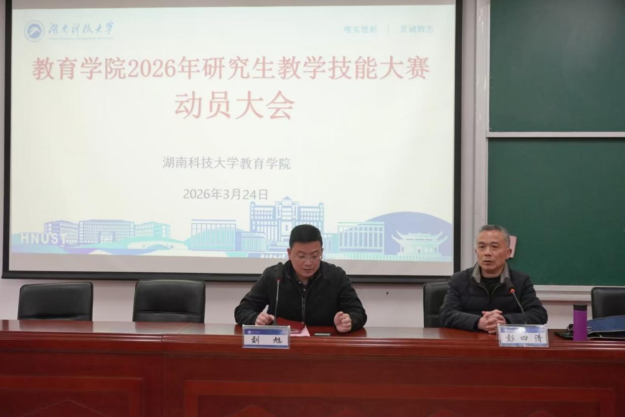 3月24日,教育学院2026年研究生教学技能大赛动员会在雨湖校区第二教学楼102教室顺利召开。本次动员会特邀湘潭市第二中学副校长彭四清担任主讲嘉宾,教育学院副院长刘旭主持会议,学院全体研究生参会。