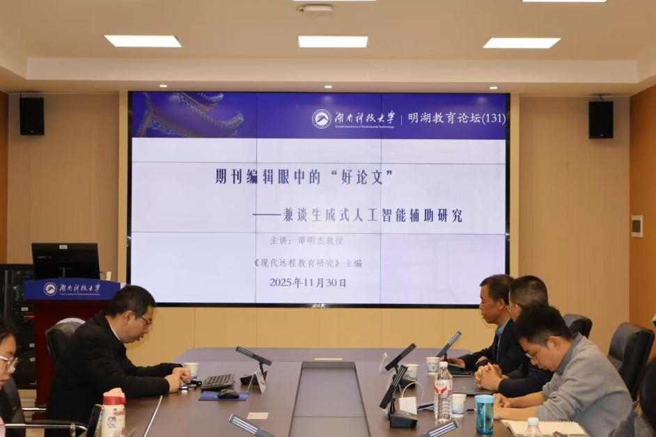 11月30日,四川开放大学科研处处长、《现代远程教育研究》主编谭明杰教授做客“明湖教育论坛”,在敏行楼A333教室为我院师生带来“编辑眼中的‘好论文’——兼谈生成式人工智能辅助研究”主题讲座。讲座由教育学院副院长张进良主持,教育学院青年教师代表及硕士研究生约50人参加论坛。