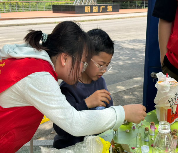 ▲大手牵小手,志愿者与小朋友共同制作许愿瓶