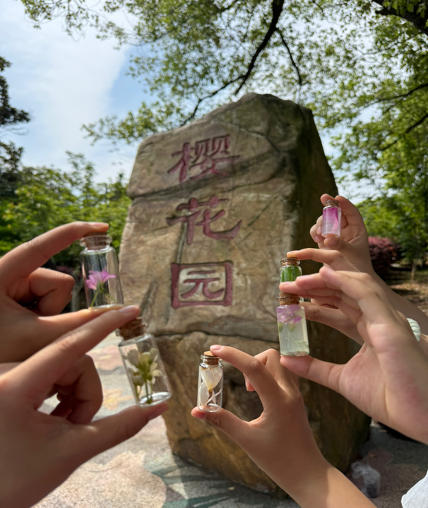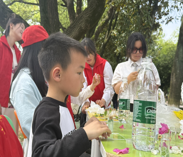 活动现场,大家利用玻璃瓶、花瓣、落叶等材料,精心制作许愿瓶,在装填过程中体悟落花的浪漫。在花瓣标本制作环节,志愿者和师生共同选取新鲜花瓣与花枝,通过整理、压制、定型等步骤,将花朵的绮丽形态封存定格,留存春日温柔。