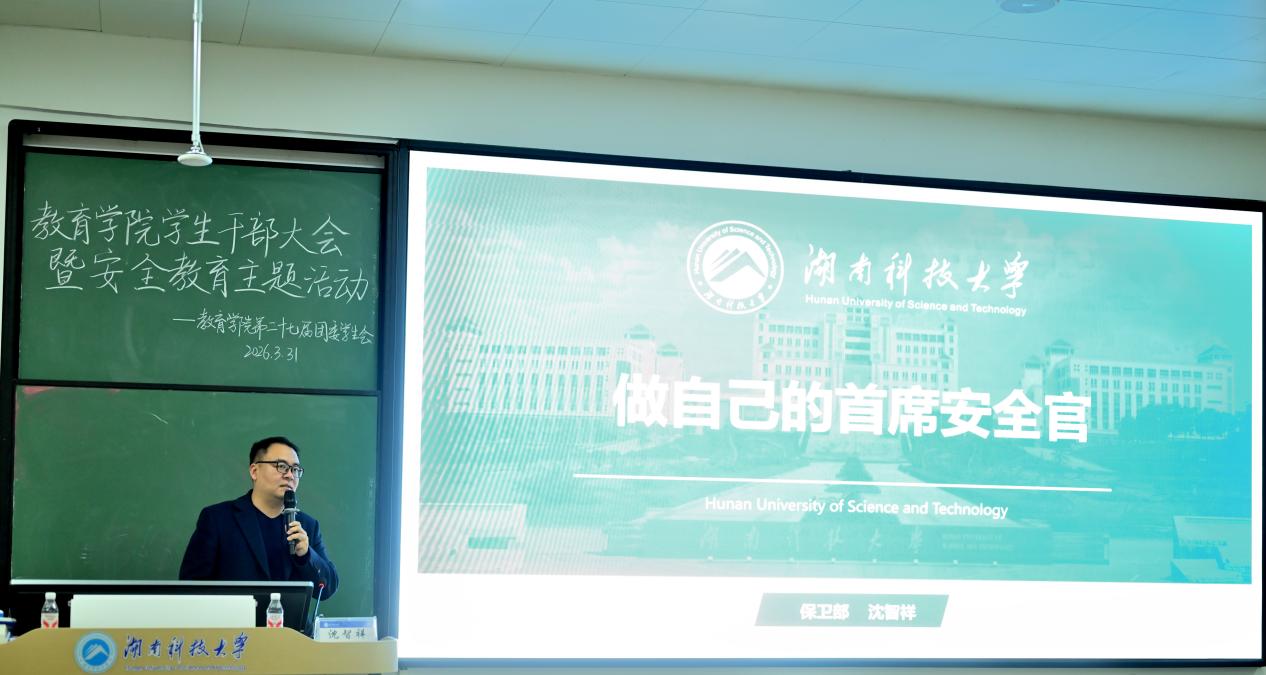 为切实增强师生安全防范意识,筑牢校园安全防线,3月31日,教育学院在第八教学楼101教室组织开展“做自己的首席安全官”主题安全教育系列活动。本次活动由湖南科技大学保卫处、武装部部长沈智祥主讲,院党委副书记文红梅主持,学工办主任罗江林、团委书记张礼林、辅导员胡银华出席,教育学院第二十七届团委学生会全体学生干部参加。
